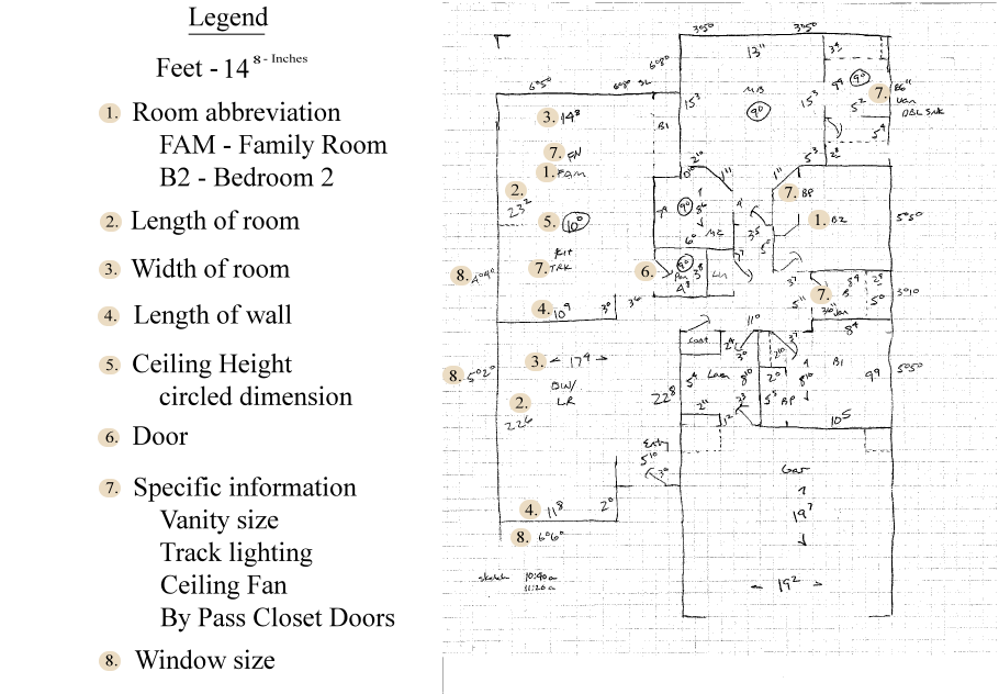 Site inspection techniques vary with each individual but the basics remain the same. Because our experience is associated with providing insurance companies estimates as a part of direct repair provider programs, the use of the Sketch module in Xactimate ® was a requirement. The Sketch and the notes applied to the diagram gives insurance company estimate reviewers the added visual information to assist in thier review of the estimate. Our system employs the use of Sketch exclusively. For a ProDescs ® professional to provide an estimate for a homeowner, contractor or insurance representative, a diagram must be provided. Below is a sample field sketch that was completed on site. The basics are simple and include: a diagram of the floor plan; room dimensions that include ceiling height(s); notes about room specifics, such as, the length of a vanity cabinet or sliding closet doors as opposed to bi fold closet doors.